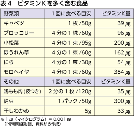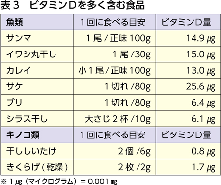 ビタミンDやビタミンKも骨にとって重要な栄養素です。ビタミンDは魚類やキノコ類に多く含まれ(表3)、ビタミンKは緑黄色野菜や鶏肉、納豆などに多く含まれます(表4)。