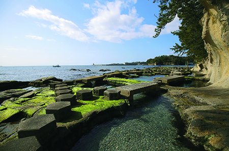 「のと海洋ふれあいセンター」の裏手に海岸を散策できる遊歩道があり、子どもでも簡単に渡れる飛び石が。足元に透き通る海面を眺めながら一歩ずつ渡っていると、いつの間にか少女に戻ったかのようなウキウキ気分になりました。