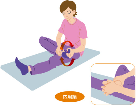 (2)左手で右足のつま先をおさえて、足首を回す(内回し10回+外回し10回を1~3セット)。