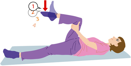 (1)仰向けになって右膝を曲げ、右足のももの裏を両手で支えて持ち上げる。