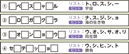 (1)ロ(スペースシャトル) (2)ョ(シロナガスクジラ) (3)リ(オオサンショウウオ) (4)ト(センテヒッショウ)