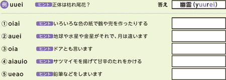 ある言葉をアルファベットにした際の母音(アイウエオ)だけが並んでいます。ヒントを手がかりにもとの言葉を推理してください。