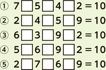 いずれも10になる計算です。□には+かーのどちらかが入ります。式を成立させてください。
