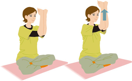 (2)できるだけ両肘が離れないようにしながら、両腕を上へ持ち上げる。