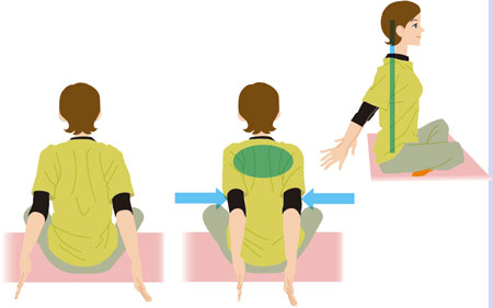 (1)床にあぐらをかいて座る。二の腕を床と平行にして、顔の前で両肘・両前腕を近づける。