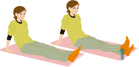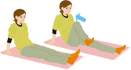 (1)床に足を伸ばして座り、手は後ろについて身体を支える。