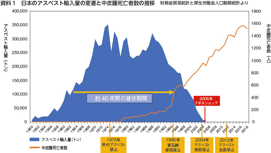 では、アスベストの被害は少なくなってきたのでしょうか? 資料1は日本のアスベスト輸入量の変遷と中皮腫死亡者数の推移です。中皮腫はほとんどがアスベストによるもので、致死率の高いがんです。クボタショック当時は年間1000人程度でしたが、最近では1500人を超え1・5倍となっています。アスベストの輸入量と中皮腫患者数の間には、約40年間という長い潜伏期間があることがアスベスト被害の特徴の1つです。