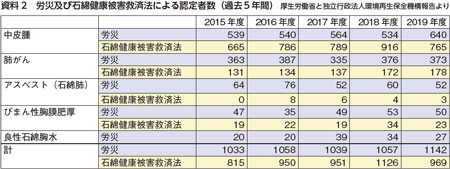 資料2は過去5年間の疾患別の認定者数です。毎年2000人程度がアスベスト関連疾患で認定されていることが分かります。まさにアスベストは最大の労災であり、公害であると言えます。