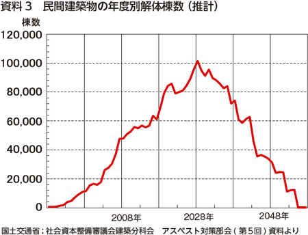 資料3は木造や戸建てを除いた民間建築物の年度別解体棟数の推計です。8年後の2028年には10万棟に達し、ピークとなる見込みです。