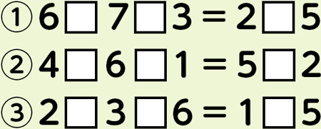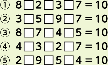 いずれも結果が10になる式です。□には+かーのどちらかが入ります。式を成立させてください。