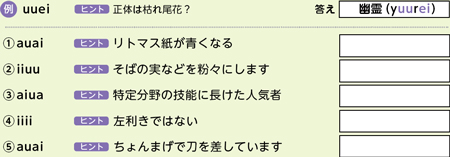 ある言葉をアルファベットにした際の母音(アイウエオ)だけが並んでいます。ヒントを手がかりにもとの言葉を推理してください。