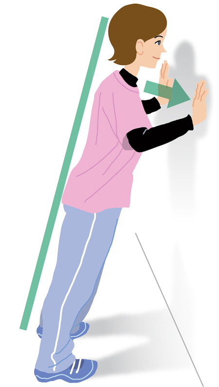 (1)足を肩幅に開き、両手を肩幅より少し広めにして壁につく。