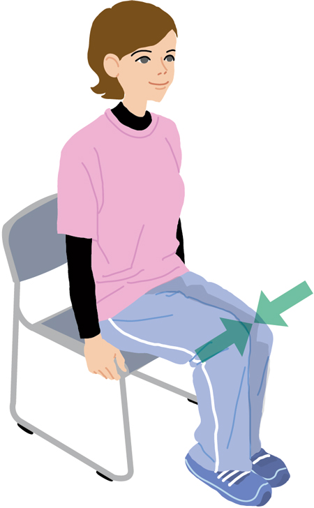 (1)いすに浅めに腰かけ、膝を直角にして背筋を伸ばす。
