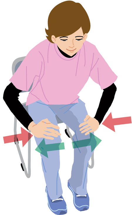 (3)足は外側へ開くように、手は足が開かないように、それぞれ押し合い力を入れる(10秒×2~3セット)。