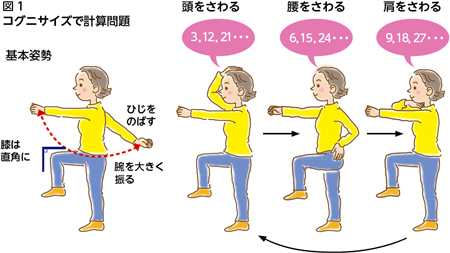 もうひとつの運動方法としてコグニサイズを紹介します。コグニサイズの基本姿勢は足踏みから。膝は直角になるべく太ももを高く上げ、腕は前後に大きく振ります。足踏みをしながら頭を使うのが特徴です。まずは計算問題をやってみましょう。