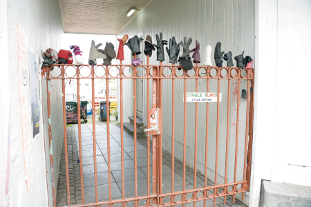 その道の少し先にトガリンボウの門の家があって、その門扉のてっぺんに片方ずつの手袋がいっぱいかぶせてあった。拾い物らしい。手袋がない人は使いなさい、という善意の門扉なのだ)。