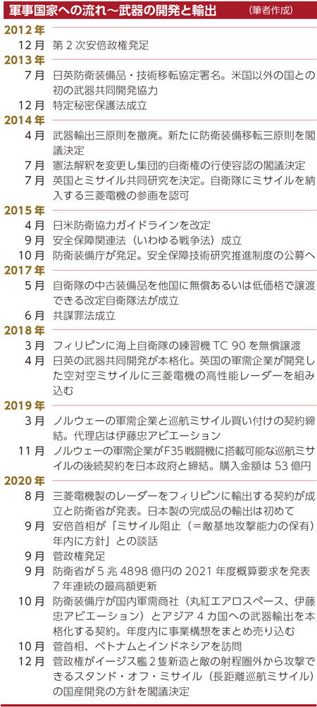 前号では「進む軍事研究」の現状を紹介したが、菅政権によって武器の開発と輸出も本格化する。そして、その先にあるのは米軍と一体になった戦争への参加だ。