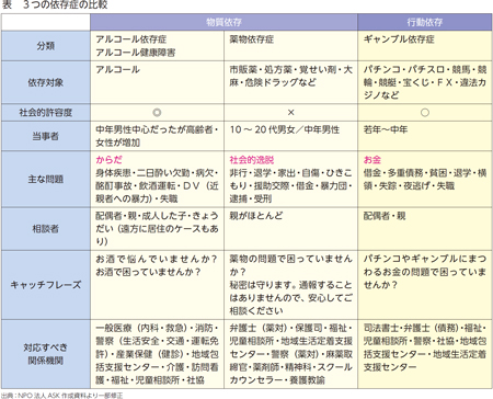 アルコール・薬物・ギャンブルという特にメジャーな依存症に関して、主な問題や関係機関をにまとめました。