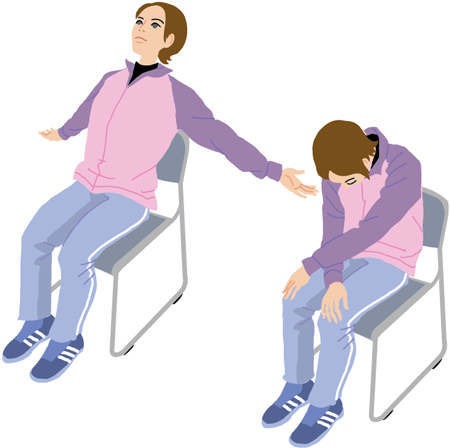 (1)いすに座り、両腕をクロスして膝の上に置く(手のひらは下向き)。