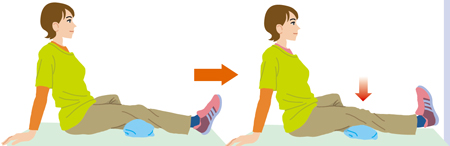(1)床に右脚を伸ばして座り、膝の下に丸めたタオルを置く。