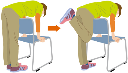 (1)いすもしくはテーブルに手を置き、両脚をそろえて前屈みに立つ。
