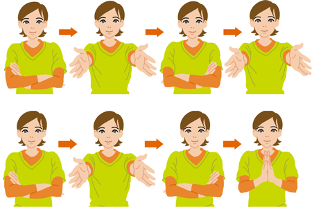 右腕を上にして腕を組む→両腕を前へ伸ばす→左腕を上にして腕を組む→手をたたく