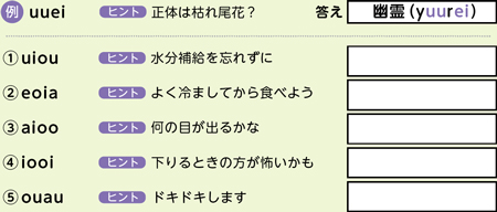ある言葉をアルファベットにした際の母音(アイウエオ)だけが並んでいます。ヒントを手がかりにもとの言葉を推理してください。