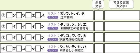 □にリストの中から適切な文字を入れて言葉を作ります。リストの文字のうち、余る文字はどれでしょう?