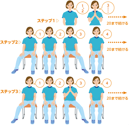 1から20までカウントしながら、イラストのように片足ずつ交互に「開いて閉じる」を繰り返す(奇数で開き偶数で閉じる)