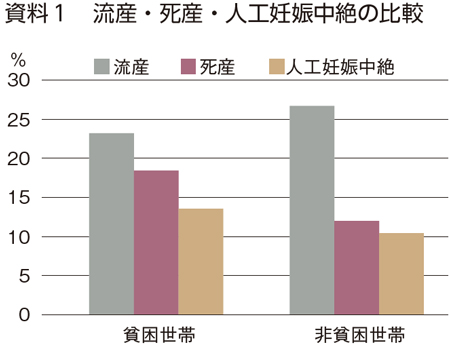 医療の面で気がかりなのは死産の割合が高いことで、貧困世帯はそれ以外の世帯の1・5倍でした(資料1)。
