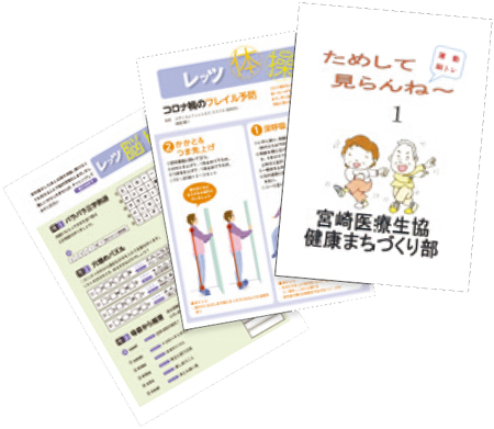 宮崎医療生協は全国に緊急事態宣言が出た昨年4月から、感染予防情報に加え、体操や脳トレの資料を組合員に配布。今年4月以降は毎月、そうした資料をまとめた冊子「ためして見らんね~」を500冊発行している。