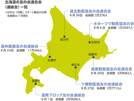 今年は道内6つの医科法人と友の会連合会(連絡会)のうち4つが8月中に月間スタート集会を開き、9月から動き始めた(地図参照)。