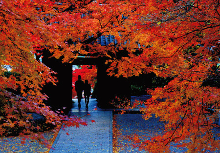 茅葺屋根の本堂と、樹齢600年の大楠が、モミジやイチョウの赤や黄色に包まれます。凜とした山寺の秋の風情に心静かな感動が。約7万5000平方メートルの広大な敷地は大興善寺契園として山林植物園に整備され、約500本のモミジが杉や檜の木々の間から顔をのぞかせ、多彩なコントラストを添えます。