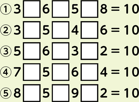 いずれも結果が10になる式です。□には+かーのどちらかが入ります。式を成立させてください。