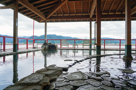 町名のとおり湖底から湧き出るお湯、県特産の梨、海岸に広がる白い砂浜と、特色ある風光明媚なまちは五感を大いに刺激してくれます。