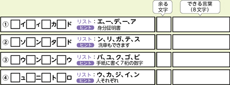 □にリストの中から適切な文字を入れて言葉を作ります。リストの文字のうち、余る文字はどれでしょう?