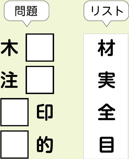 □には全て同じ漢字が入ります。リストから1つ漢字を選んで、4つの二字熟語を完成させてください。