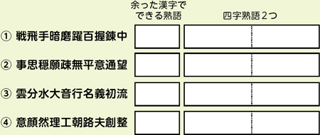 1 0個の漢字の中から四字熟語を2つ作ると2文字が余ります。