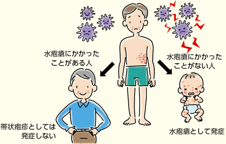 子どもの頃に水疱瘡にかかったことはありますか。水疱瘡にかかると、水疱瘡の免疫ができます。水疱瘡は治ったように見えても、ウイルスが消えているのではなく、身体の神経節に住み着いています。