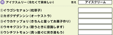 (1)清少納言 (2)管弦楽団 (3)計量カップ (4)腹式呼吸 (5)猪突猛進
