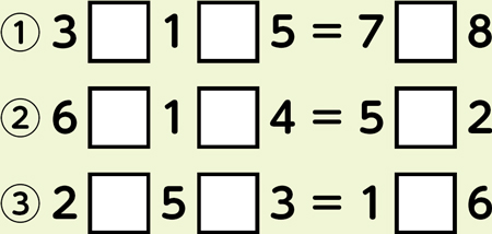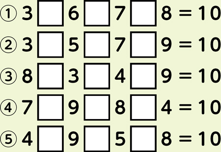 いずれも結果が10になる式です。□には+かーのどちらかが入ります。式を成立させてください。