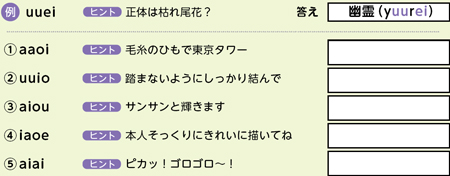 ある言葉をアルファベットにした際の母音(アイウエオ)だけが並んでいます。ヒントを手がかりにもとの言葉を推理してください。