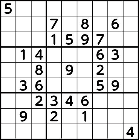 縦の列(9列)、横の列(9列)、太線で囲まれた3×3のブロック(9個)に、それぞれ1~9までの数字が入ります。