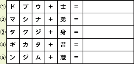 (1)ブ士ドウ(武士道) (2)マナ弟シ(愛弟子) (3)身ジタク(身支度) (4)昔カタギ(昔気質) (5)ムジン蔵(無尽蔵)