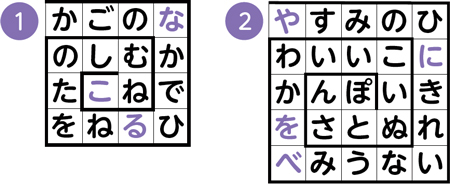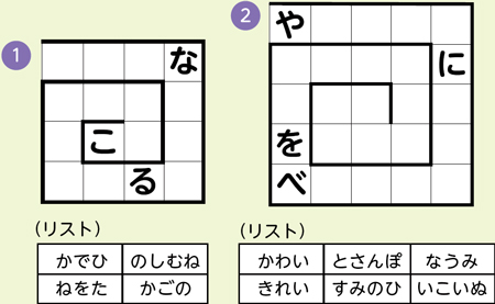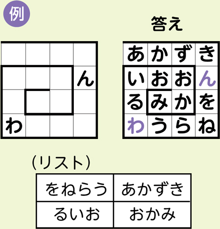 文章がつながるように、盤面の左から中心に向かってリストの中から文字を入れます。盤面の途中にある文字はヒントです。例題を参考に挑戦してください。