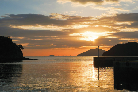 宮浦港(宮ノ浦地区)の正面にあるレストランゆうなぎでは、珍しいなおしまひらめを提供しています。なおしまひらめは、全国でも数少ない海水の紫外線殺菌で、消毒薬を使わず人にも環境にも配慮して卵から育てています。「始めて30年以上、島周辺の水温の変化が激しい環境でも生き残ることができる魚を探して、ヒラメにたどり着きました」と、近くの能見海岸の養殖場で元気なヒラメに餌をやるのは堀内健司さん。