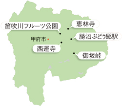 このほか、フルーツ王国を満喫するなら笛吹川フルーツ公園(山梨市)を訪れてみるといいでしょう。一年を通して約50種類190品種6000本が実る果物のテーマパークで、収穫体験や料理教室などさまざまなイベントがあります。フルーツ公園から車で5分ほどの場所にはほったらかし温泉があり、露天風呂から富士山を楽しめます。おいしいものに舌鼓を打つもよし、歴史に思いを馳せるも よし、ぜひ山梨を満喫してください。