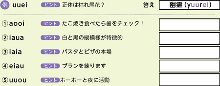 ある言葉をアルファベットにした際の母音(アイウエオ)だけが並んでいます。ヒントを手がかりにもとの言葉を推理してください。