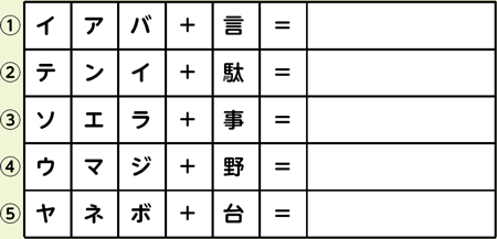 (1)アイ言バ(合言葉)(2)イ駄テン(韋駄天)(3)エソラ事(絵空事)(4)野ジウマ(野次馬)(5)ヤ台ボネ(屋台骨)