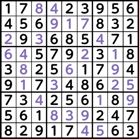 同じ列や同じブロックに同じ数字がだぶって入らないように、マスを埋めてください。